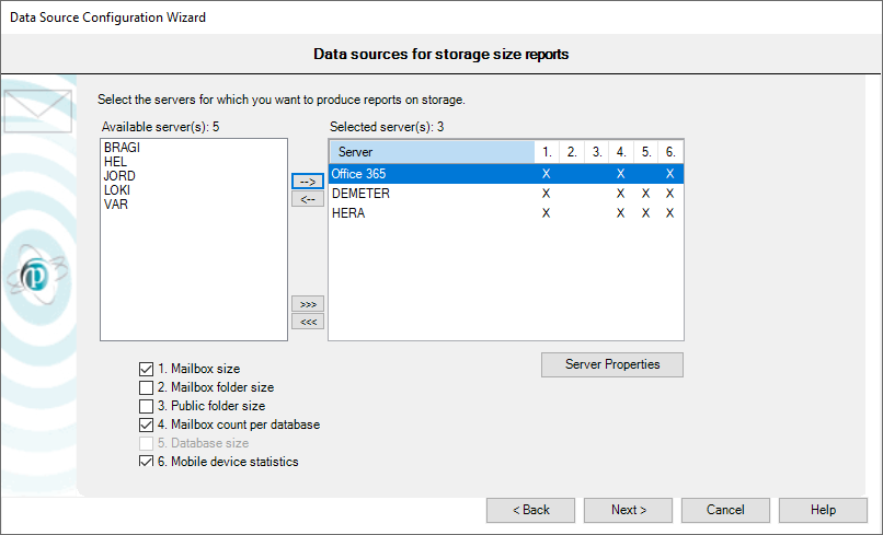 Promodag Reports will use this data source to generate storage size reports. Select the servers whose storage size (mailbox and public folder size, Exchange database size) will be imported.