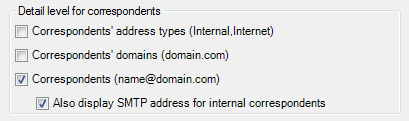 | Display Correspondents' Address | Display the full SMTP address for internal correspondents as well. If this check box is not selected, the report will only display their display name. |